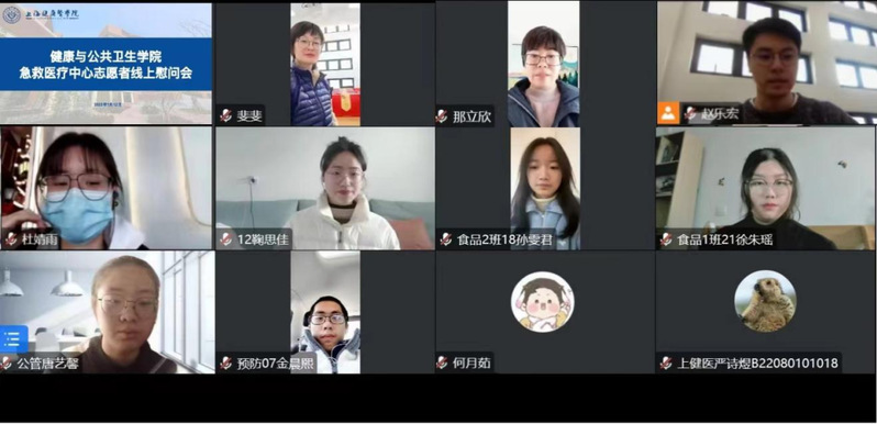 2023年1月19日下午1:30,为弘扬志愿服务精神,关心、关爱学院急救中心志愿者,万象城allwincity官网组织线上120医疗急救中心志愿者线上慰问会,学院党总支书记顾斐雯、副院长那立欣出席,团总支书记赵乐宏主持,10位志愿者代表参会。
