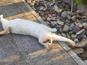 小猫是在午后在河边漫步是与我相遇的,在河边石板旁找到阳光酒落之处,躺下,肚皮朝上,我分明在它身上看出午后情懒的具象形状。在它清澈的眼眸中我看到了秋日的落叶,潺潺的河流,偶尔会飘落的小花,也有阳光洒落在玻璃窗上的反射,下课后步履匆匆的我自己,它肆意沐浴着秋日的夕阳,伸懒腰动作慢憨悠的,好像在告诉世界,这个秋日的午后,最美好的事情就是放慢脚步,享受阳光。
