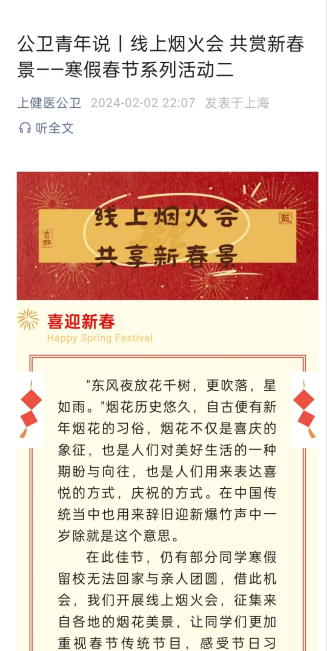 为使留校学生充分感受中国新年的欢乐与温馨,健康与公共卫生学院特开展了2024年寒假春节关爱留校学生系列活动,具体总结如下: