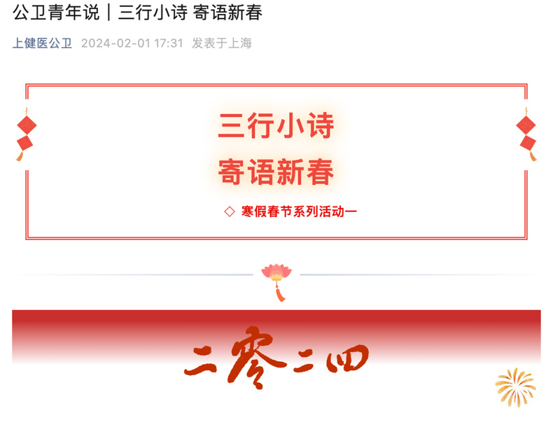 刚刚过去的2023年,是浓墨重彩的一年。新的一年已经开始了,正值春节期间,为了让同学们更好地感受节日习俗和氛围,珍惜和分享阖家幸福的时刻,用对新春的三行小诗来寄托我们对新年的美好祝福。线上征集活动既能体现中华优秀传统文化的魅力,又给了同学们一个展示自己和提升自己的舞台。