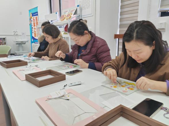 在温馨甜蜜的压花相框制作活动中,讲解老师向大家现场展示了相框的制作过程。随后,女教工们自己挑选喜欢的压花,边动手设计,边欢乐地交流家庭生活工作,现场欢声笑语,其乐融融。
