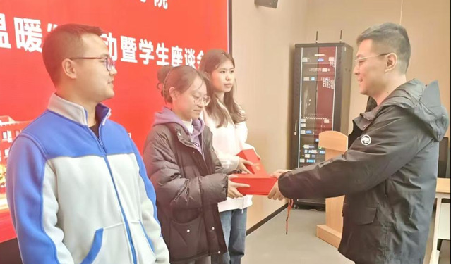 随后,老师们逐一向学生代表发放御寒物品。大家对学校和学院精心准备的礼物表达了感谢,认为保温杯既实用又贴心。多位同学提到,这种面对面的沟通特别温暖,老师们的建议也让他们对未来发展方向更加清晰,之后也会更加专注学业,用专业知识服务社会。