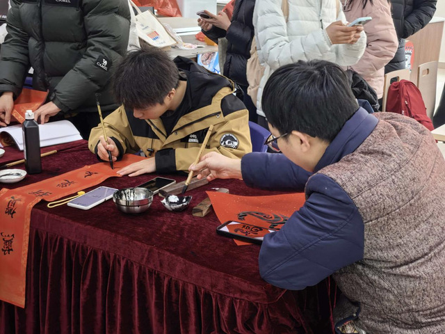 “‘福’字不够,团长加急写”成为活动现场的暖心插曲。围观的师生们或驻足欣赏笔墨风采,或排队等候心仪的“福”字,食堂里欢声笑语不断,烟火气与墨香、年味交织,成了冬日校园里最温暖的风景。