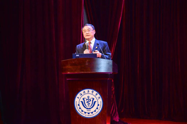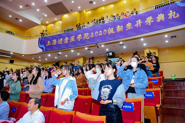 由我校校党委书记郑锦领誓,新生们庄严起誓,一起立下除人类之病痛,助健康之完美,为守护人类健康,奋斗终身的医学生誓言。