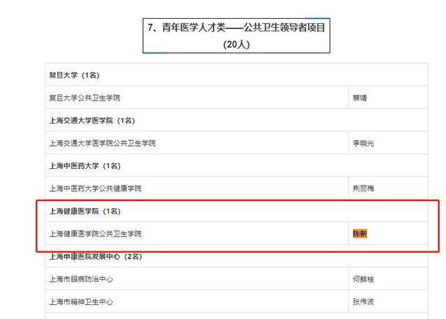 近日,由上海市卫生健康委员会、上海市医药卫生发展基金会共同审定,陈新等同志入选2020年上海市“医苑新星”青年医学人才培养资助计划-青年医学人才类公共卫生领导者项目。