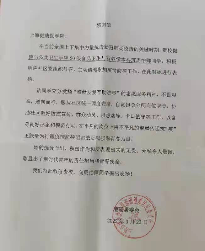 3月20日,周怡卿同学穿上防护服,加入了小区大白队伍,当天下着淅淅沥沥小雨,气温骤降,她身披雨衣挨家挨户上门核对居住人口信息,帮助不会操作的老人完成健康云登记,随后组织大家前往核酸检测点。她说:“相比于晴天,下雨天组织社区居民去做核酸检测更需要做好动员、思想劝导工作。”当她看到一位妈妈抱着2岁的小宝宝在雨中排队等着核酸检测时,她果断地上前与其他排队的人耐心沟通,让这位小宝宝提前完成核酸检测。在服务期间,她服从社区统一调度安排,自觉担负分配岗位职责,协助社区做好防控宣传、动员群众、思想劝导、卡口值守等工作,以自身良好的形象和模范行动,以及挺身而出、积极作为,彰显新时代青年的责任担当和青春使命,得到周浦镇澧溪居委会的肯定,特地写来感谢信,赞扬她的主动请缨、无畏逆行的无私行为!