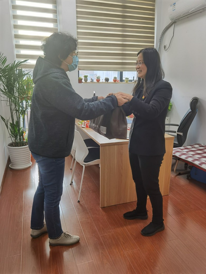 3月26日下午,新南苑综合办于莹副书记、办公室主任杜峥、工会李瑾老师赴万象城allwincity官网看望慰问了在疫情防控一线值守的学院教师,表达了郭永瑾书记、吴韬校长等学校领导对学院教师的关心,并送上了慰问品。